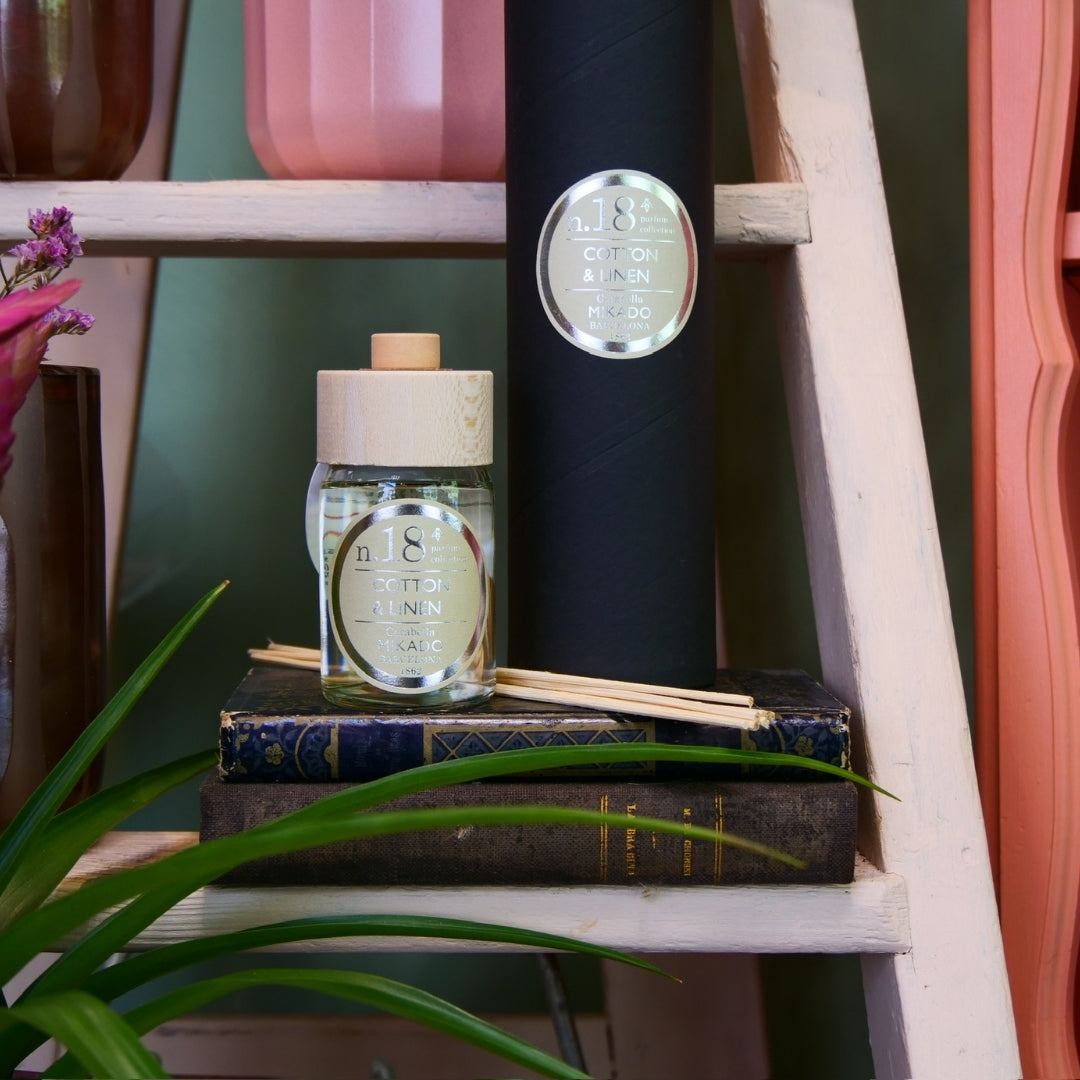 Diffuseur d'ambiance avec bâtonnets, aux notes douces et réconfortantes de coton et lin.