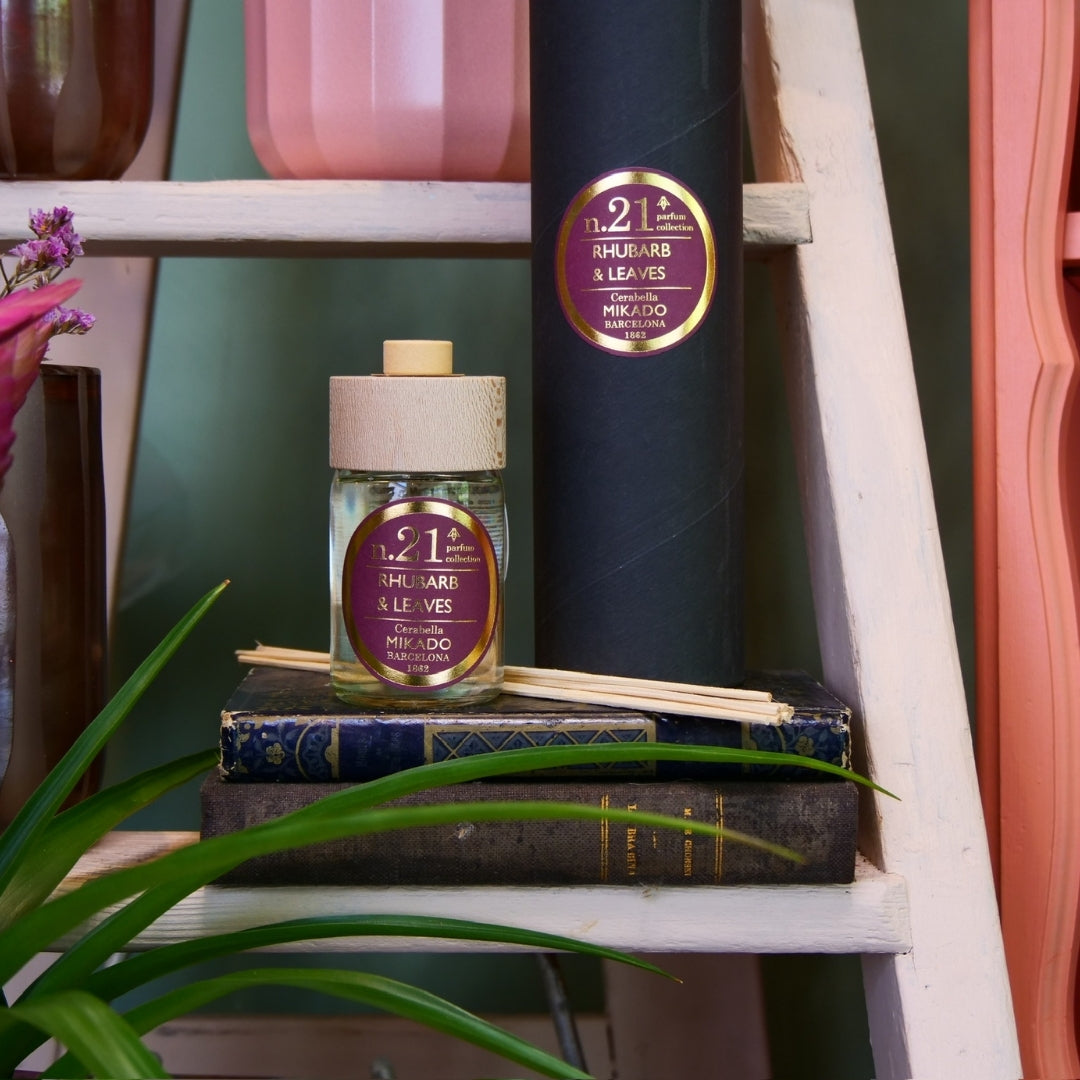 Diffuseur d'ambiance avec bâtonnets, aux notes gourmandes et herbacées de rhubarbe et de feuilles, pour parfumer tous les intérieurs.