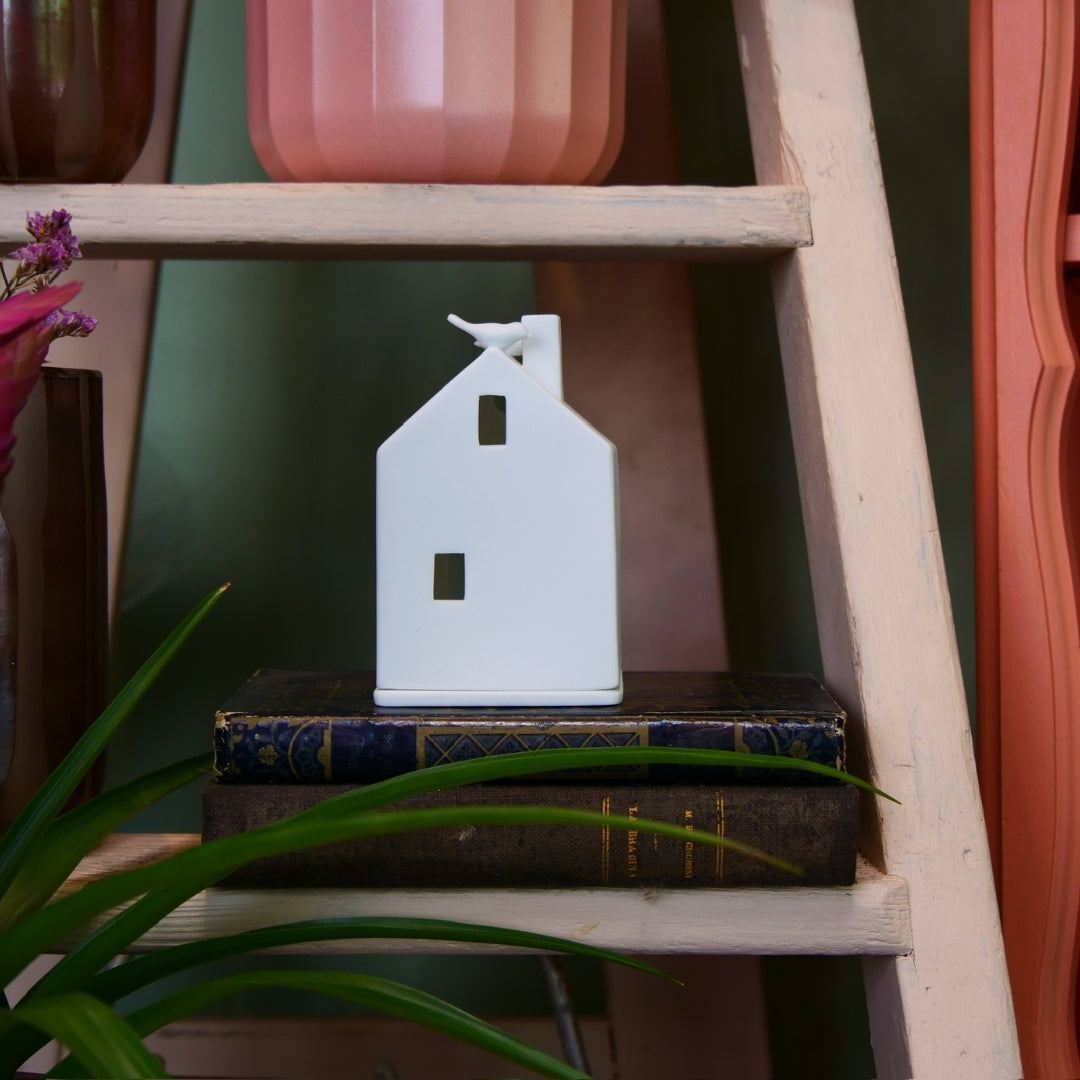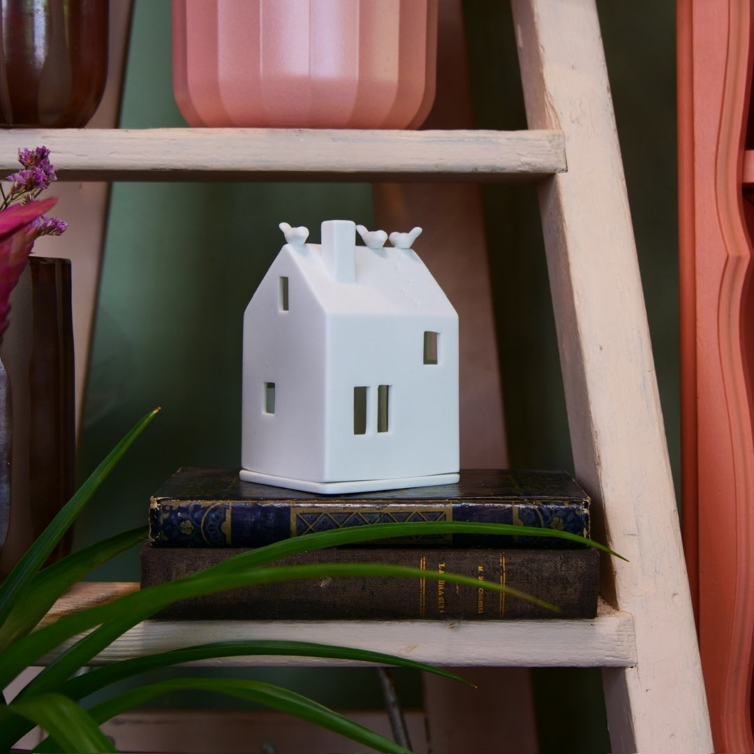 Ce photophore poétique représente une petite maison blanche sur laquelle trois oiseaux se sont posés. Une fois une bougie glissée à l’intérieur, la lumière s’échappe par les fenêtres pour créer une ambiance douce, chaleureuse et pleine de charme.